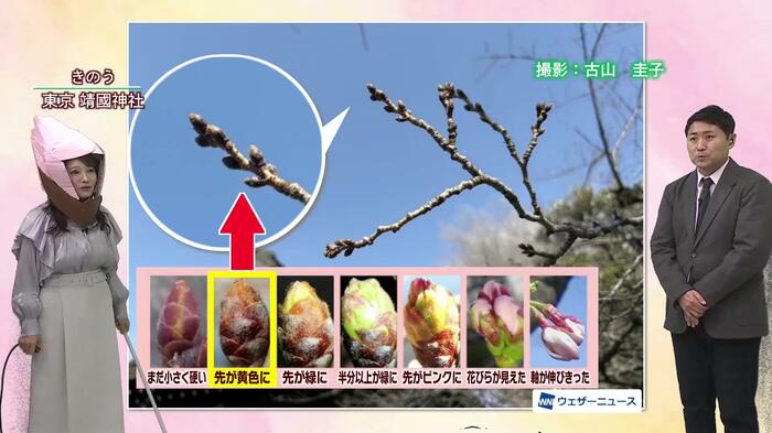 現地で確認したところ、標本木のつぼみはまだ「小さく硬い」状態でしたが、「先がわずかに黄色く」なっていたそうです。古山予報士の見立てでは、あと22日~23日かな、というところで、予想通りではないかと話していました。