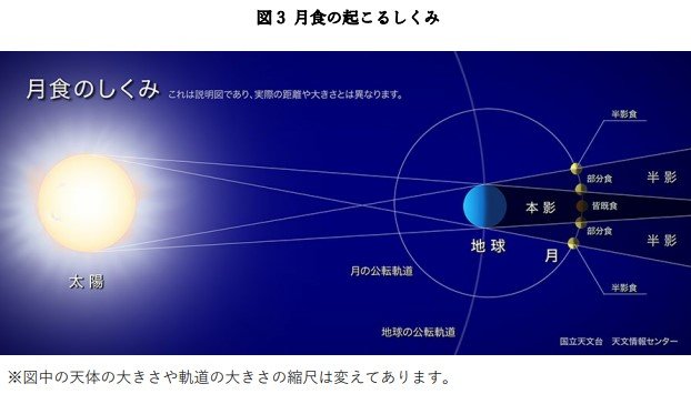 月は太陽の光を反射して光っているが、月食は、太陽と月の間に地球が入り、地球の影の中に月が入ることで起こる。