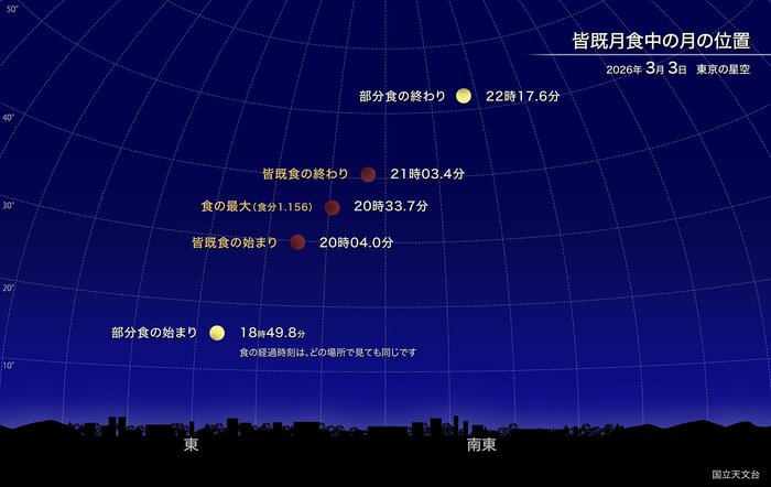 今回の皆既月食は日本全国で観察可能。北海道から沖縄まで、月の出のタイミングによって開始時点の見やすさに若干の違いがあるが、皆既食の時間帯には十分な高度に達し、広い範囲で観察できる。天候さえ良ければ、特別な道具は不要で、肉眼でも十分楽しめる。