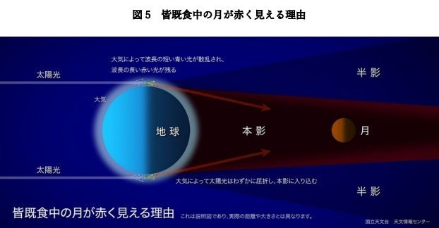 皆既中の月は普段の黄色ではなく「赤銅色」と呼ばれる赤黒い色に染まる。これは太陽光が地球の大気を通過する際に、波長の長い赤い光は地球の大気で散乱されにくく、赤い光だけは大気を通過できて月に届くため。朝日や夕日が赤く見えるのと同じ原理だ。