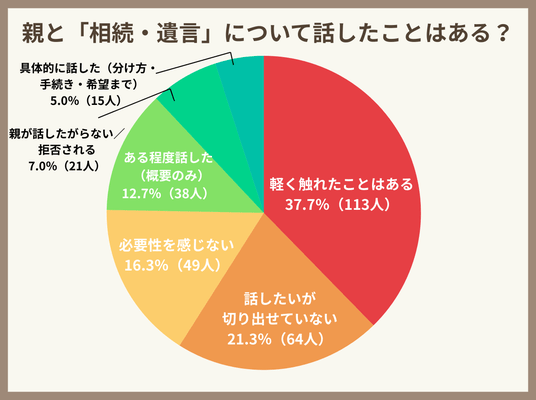 ・親の遺言書が「ない」と把握している人は51.7%(155人)、「分からない」は38.0%(114人) ・親と相続・遺言について「軽く触れたことはある」37.7%(113人)。一方「話したいが切り出せていない」21.3%(64人)