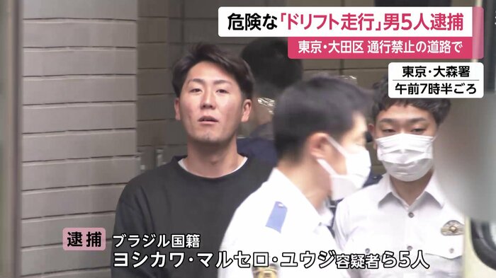 ブラジル国籍のヨシカワ・マルセロ・ユウジ容疑者(27)ら5人は2025年、東京・大田区の道路を車でドリフト走行しながら蛇行運転を繰り返した疑いが持たれています。