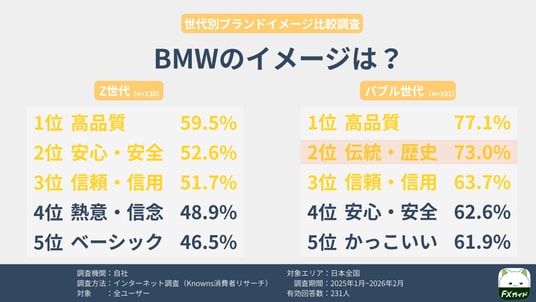 全体として、Z世代では「信頼・信用」「高品質」「安心・安全」といった"堅実さ"に関わる項目が上位に入りやすい一方、バブル世代では3ブランドすべてで「伝統・歴史」がTop5に入りました。特にBMWでは、バブル世代の「伝統・歴史」が2位(73.0%)となっており、世代差が明確です。