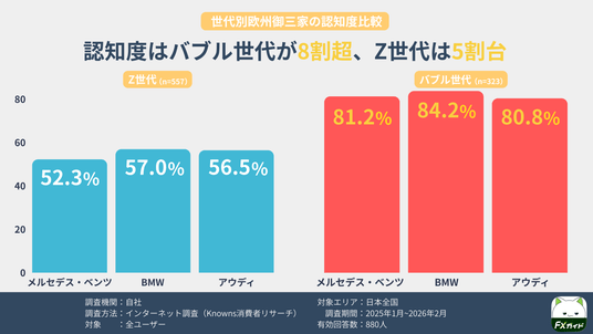 Z世代とバブル世代の「将来乗りたいクルマ」Top3を比較し、背景として『メルセデス・ベンツ』『BMW』『アウディ』の「ブランドイメージ」と「認知度」を比較