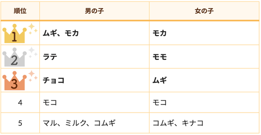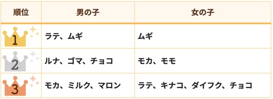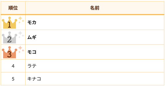 2位は「ラテ」3位は「モカ」と飲み物や食べ物にちなんだ名前が並びました。