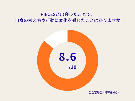 子どもの周りに信頼できる他者を増やす活動を展開する認定NPO法人PIECES(東京都文京区、代表理事:斎典道)は、継続寄付者「PIECESメイト」を対象としたアンケート調査を実施しました。 その結果、寄付を通じた社会貢献が、支援者自身の「考え方や行動の変化(10点満点中 平均8.6点)」、さらには市民による主体的なアクションへとつながっているという、寄付の新しい価値が浮き彫りとなりました。