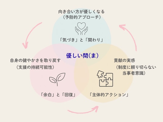 - 「自身の健やかさを取り戻す」= 支援の持続可能性「無理をして助ける」のではなく、支援する側も健やかであること。市民一人ひとりが心のゆとり(余白)を持つことで、地域全体にレジリエンス(回復力)が生まれます。