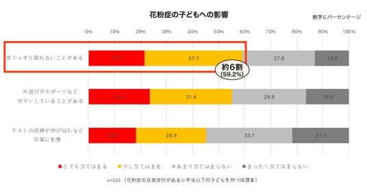 保護者を対象とした調査 (n=525) では、花粉症の子どもについて以下の影響が確認されました。・約60%が「夜ぐっすり眠れていない」