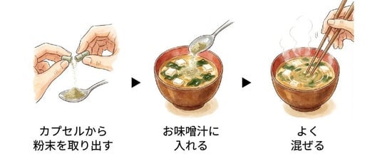 植物性カプセルを開き、味噌汁やスープに混ぜることで、子どもでも無理なく取り入れることが可能