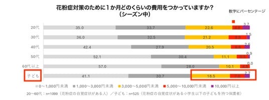 また、花粉症対策の費用面からみても子どもの花粉症対策に「月3,000円以上」と回答した割合が28.2%にのぼりました。一定の費用負担が生じている実態もうかがえます。
