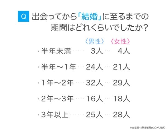 既婚者の男女200人に「出会ってから『結婚』に至るまでの期間はどれくらいでしたか?」と尋ねました。