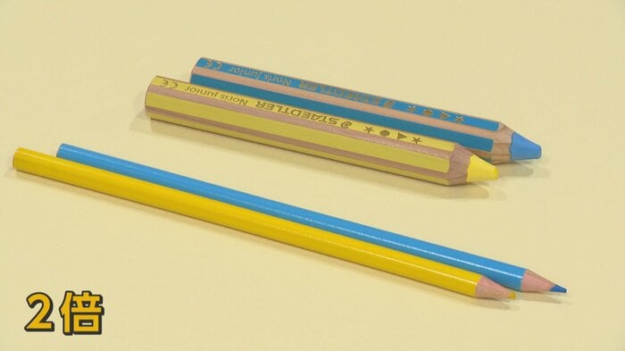次に注目したのは、通常の倍の太さを持つ色鉛筆だ。朔くんも驚くほどの太軸は、六角形で握りやすく、芯が折れにくいのが特徴である。柔らかくて太い芯は描き心地も抜群で、さらに水でなぞれば水彩画のような仕上がりになり、1本で2度楽しめる設計となっている。