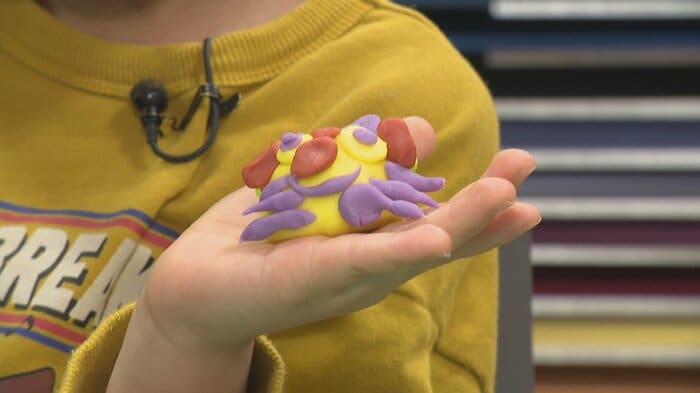このねんどの特徴は、柔らかく、手にくっつきにくく、乾きにくい3つのポイントにある。朔くんは黄色いねんどを使ってトラを作り、ヒゲと目をつけて完成させながら「なんか楽しい」と創作活動を楽しんだ。