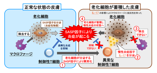 本共同研究グループはこれまで、マクロファージによる老化細胞の除去機構に着目し研究を進めてきました*1。今回、皮膚の真皮における老化細胞の蓄積メカニズムを解析した結果、本来は炎症を抑制する「制御性T細胞(Treg)」が老化細胞から分泌されるSASP因子により異常化すること(1.)、異常なTregが慢性炎症因子 IL-17 を分泌すること(2.)、分泌された IL-17 によりマクロファージによる老化細胞除去機能が抑制されること(3.)、その結果、老化細胞が蓄積して慢性炎症状態になること(4.)を明らかにしました。