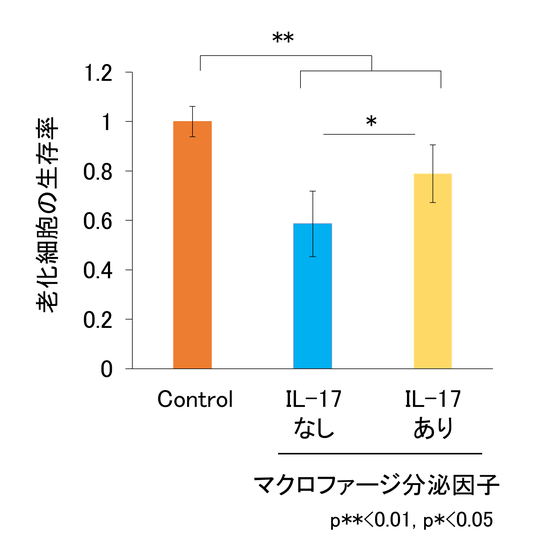 その結果、IL-17に曝露された老化細胞は、マクロファージによる細胞死誘導に対して抵抗性を持つようになることがわかりました(図5)。
