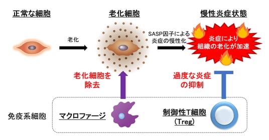 本来、このような老化細胞は、免疫細胞の一種である「マクロファージ」によって除去されています。また、過度な炎症を抑制するために、「制御性T細胞 (Treg)」 と呼ばれる免疫細胞が働き、慢性炎症が生じないように調整されていることが知られています。このように生体には、老化細胞を除去するとともに炎症を抑えることで、老化の進行を防ぐ抗老化の仕組みが備わっています(図1)。