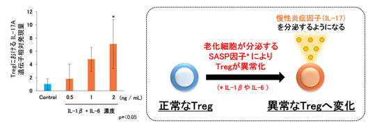 次に、異常な制御性T細胞(Treg)から分泌されるIL-17について詳細に解析した結果、IL-17がマクロファージによる老化細胞の除去機能に影響を及ぼすことが明らかになりました。