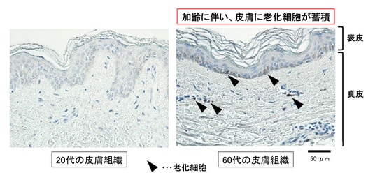 しかしながら、実際には加齢により老化細胞が蓄積し(図2)、慢性的な炎症が生じることが確認されています。そこで本共同研究グループは、免疫系細胞の働きに着目し、加齢による皮膚の慢性炎症および老化細胞の蓄積にどのように関与しているのかについて詳細に解析を行いました。