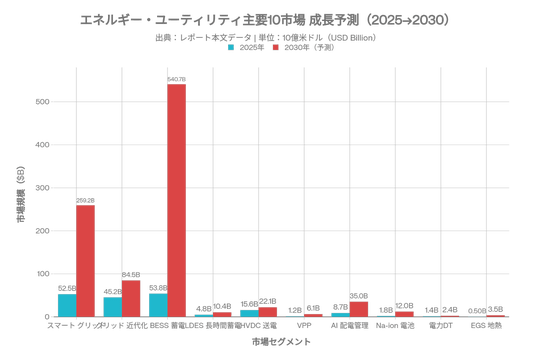 ● 蓄電池市場(BESS/LDES)・スマートグリッド市場・HVDC送電市場・VPP市場・ナトリウムイオン電池市場等、主要10セグメント以上の市場規模・CAGR・主要プレイヤーを網羅的に掲載している。