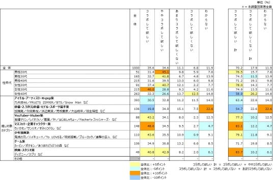 『全体』では、「コラボして欲しい 計」が約7割となった。