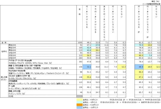 また、推し対象カテゴリー別では、【俳優・2.5次元俳優・モデル・スポーツ選手系】は『全体』と比べて「行くきっかけになる 計」が約12ポイント低く、「わからない」が6ポイント高かった。