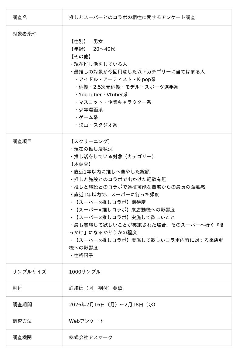 そこで今回は、生活に密着した施設である「スーパーマーケット」に焦点を当て、「最推し」とのコラボレーションに対する期待度や、来店動機への影響度を明らかにするべく調査を実施いたしました。