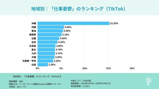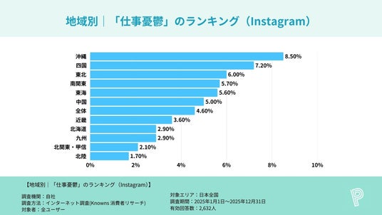 地方別の「仕事憂鬱」割合を確認すると、沖縄は複数の主要SNSで地方別1位となりました。具体的に、Threadsは沖縄17.9%で地方別1位(全体5.6%比 +12.3pt)、TikTokは沖縄15.2%で地方別1位(全体4.5%比 +10.7pt)、Instagramは沖縄8.5%で地方別1位(全体4.6%比 +3.9pt)でした。いずれも全体値を上回っています。