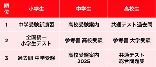 小学校1位「中学受験新演習」、中学校1位「高校受験案内」、高校1位「共通テスト過去問」
