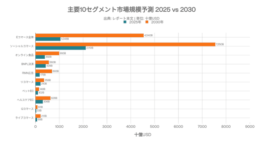 ソーシャルコマース/エージェンティックコマース/ライブコマース/コマースメディア/クイックコマース/リコマース/バーティカルECなど主要セグメントについて多元分析