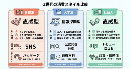 今回の4カテゴリー横断調査で、Z世代内部の購買行動の"分断"が明確になりました。特筆すべきは、大学生が『情報探索型』として独自のポジションを確立している点です。
