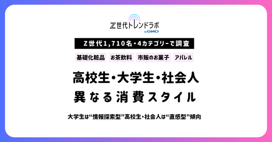 GMOインターネットグループのGMO NIKKO株式会社(※1)(代表取締役社長執行役員:佐久間勇 以下、GMO NIKKO)が提供する「Z世代トレンドラボ byGMO」では、Z世代(16~28歳)の高校生・大学生・社会人を対象に、消費行動における世代内ギャップを明らかにするため、「基礎化粧品」「ペットボトルお茶飲料」「市販のお菓子」「アパレル」の4カテゴリーについて、計1,710名へ