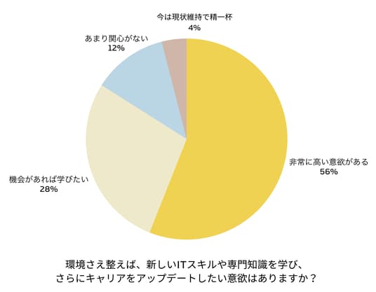 - 潜在的な成長・アップデート意欲: 環境が整えば新しいITスキルや専門知識を学び、キャリアをアップデートしたいという意欲を持つ人は、全体の84%に達している。