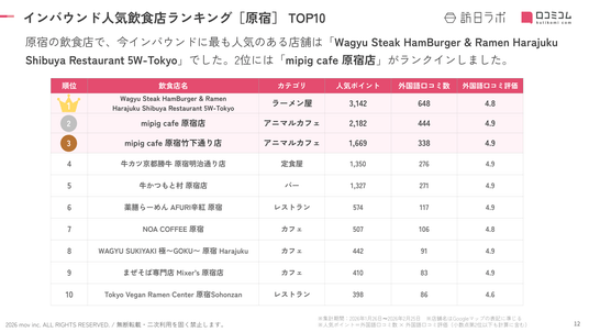 業界最大級のインバウンドビジネスメディア「訪日ラボ」及び 店舗向け集客一元化プラットフォーム「口コミコム」を運営する株式会社mov(代表取締役:渡邊 誠、本社:東京都渋谷区、以下mov)は、原宿エリアの飲食店に寄せられた最新の口コミデータから、独自の『インバウンド人気飲食店ランキング』を発表しました。