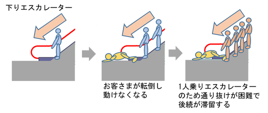 1人乗りエスカレーターの降り口付近でお客さまが転倒された場合、非常停止ボタンにより停止させなければ、後続のお客さまが押し寄せることによる二次災害が発生する可能性があります。このような状況を防ぎ、お客さまにより安全にエスカレーターをご利用いただけるよう、エスカレーター降り口付近でのお客さまの滞留状態を自動で検知し、エスカレーターの非常停止を自動で行うエスカレーター滞留停止システムを導入します。