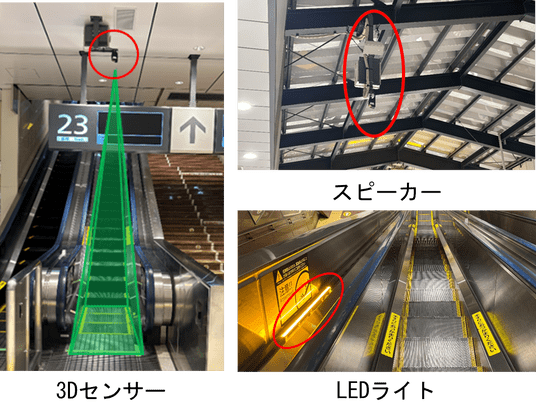 エスカレーターの降り口付近に設置した3Dセンサーによりお客さまの滞留状態を検知し、滞留状態を検知した場合、後続のお客さまへ音声ならびに光による注意喚起をおこなった後、エスカレーターを非常停止させるシステムです。エスカレーター降り口付近でお客さまの転倒等により滞留が発生した場合、エスカレーターが速やかに停止するため、群衆事故の被害を防ぐことができます。開発環境および現地においての検証が完了したため、今回正式に導入することとしました。
