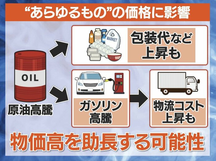 影響がすぐ出てくるのはガソリン価格です。ガソリン価格は海外での原油市場と為替の2つで決まるので、為替が動かなければ海外の原油価格の上昇と同じ幅で国内のガソリン価格は上がる。これは1週間ぐらいで影響が出てくるということですね。