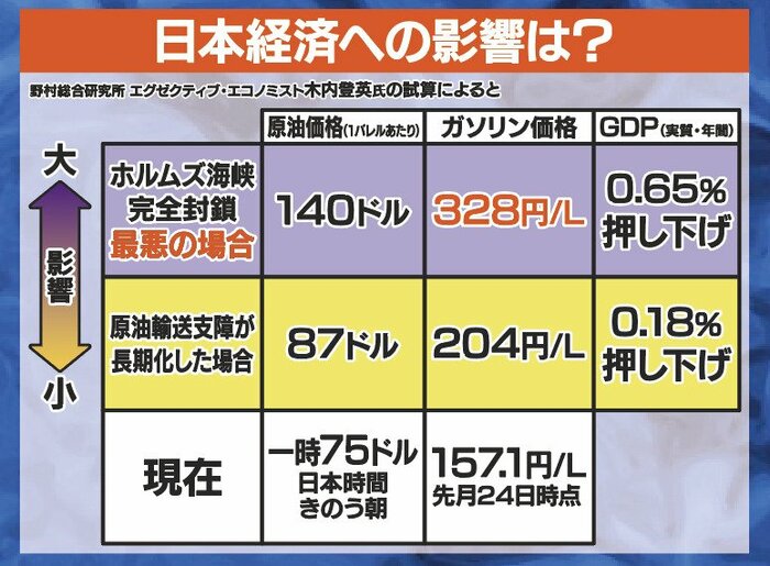 その場合、原油価格は20ドルぐらい上がるということで、87ドルというのは2024年にイランとイスラエルが交戦した時のピークの水準で、先週末と比べるとWTIで20ドルぐらい上がると。30%の上昇になって、国内のガソリン価格に換算すると200円を超えてくるという。