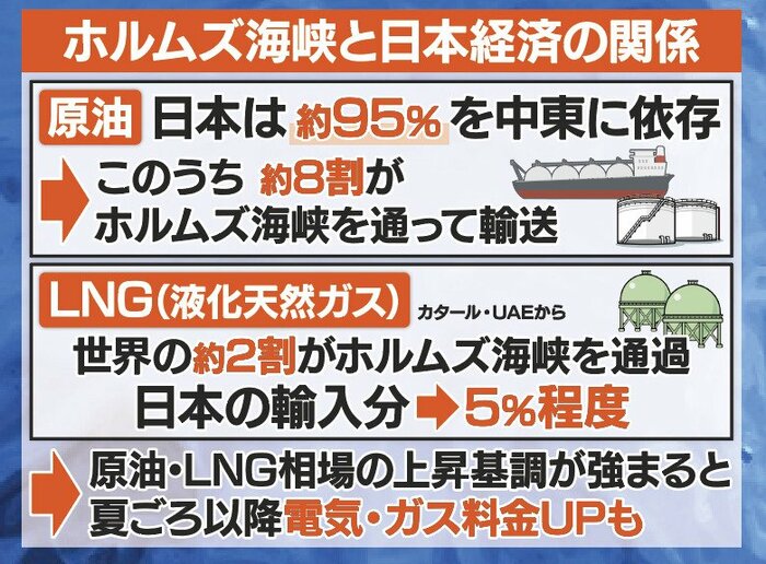 日本は原油の約95%を中東に依存している中、このうち約8割がホルムズ海峡を通って輸送されています。