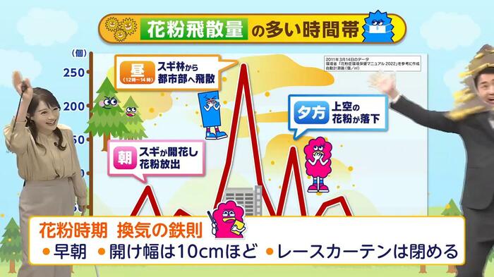 花粉が飛んでいるからといって、窓を閉め切ったままにするのは衛生面でも避けたいところ。そこで古山予報士は、花粉の侵入を最小限に抑える換気方法を提案しました。
