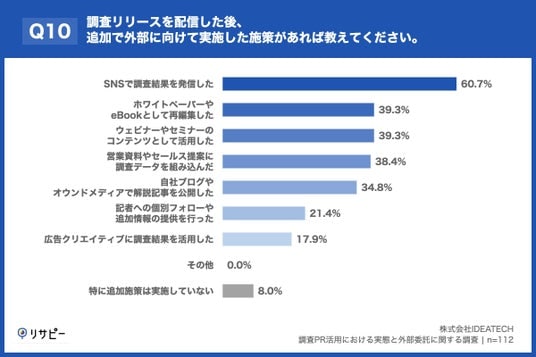 当社が行った、「調査PR活用における実態と外部委託に関する調査」(n=112)によると、調査リリース配信後にオウンドメディアや自社ブログで解説記事を公開した企業は34.8%にとどまっています。