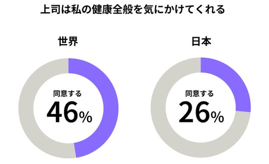 働いている人への質問では、ヘルスケアや睡眠に対する職場の理解がないと感じている傾向が明らかになりました。「上司は健康全般を気にかけてくれる」と答えたのはわずか26.4%(世界平均46.4%)、「職場の文化が休息と回復を優先している」も24.8%(世界平均44.1%)にとどまっており、健康や睡眠問題を職場で共有・解決できる環境ではないと認識されています。