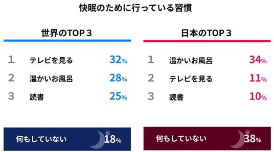 さらに、多くの日本人が睡眠不足を抱えながらも、改善すべき医学的・健康的な課題として捉えておらず、睡眠の改善へ向けて行動していない現状が明らかになりました。睡眠を改善するためのツールや習慣に関する質問では「睡眠改善ツールを何も使っていない」が57.4%(世界平均29.3%)、「睡眠改善の習慣が何もない」が38.4%(世界平均17.9%)と、どちらも世界最下位を記録しました。