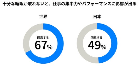 本調査から、日本の回答者は他国と比較して圧倒的にパートナーと別々で寝る「睡眠離婚」の割合が高く、睡眠時間が短いにもかかわらず、睡眠に対する健康意識(睡眠リテラシー)が低いという日本特有の課題が浮き彫りになりました。また、睡眠不足がもたらす労働生産性の低下や、職場におけるサポート不足が課題となっていることが判明しました。