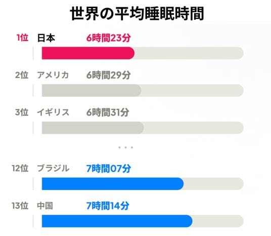 ・ 日本人の平均睡眠時間は4年連続最下位。週に1日も熟睡できない人が8.3%(世界平均5.1%)