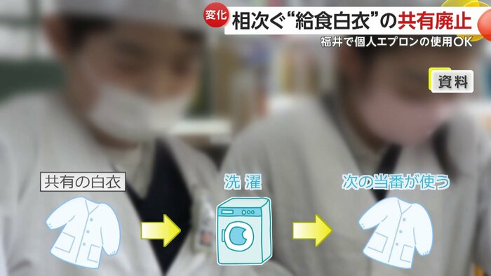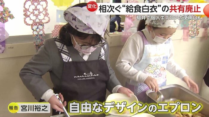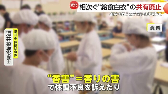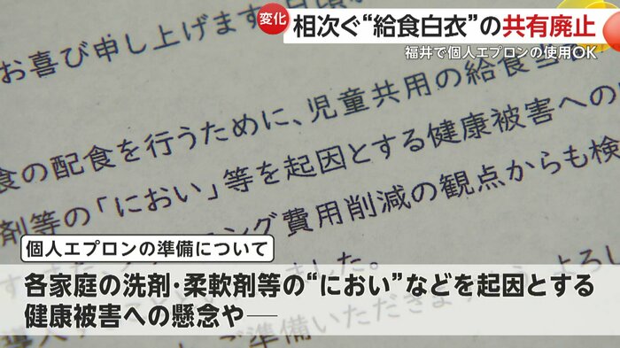 福井市は2024年7月、「におい」問題への配慮から、学校ごとの判断に基づき、個人エプロンの使用を認めると各学校に通知した。
