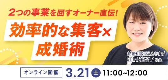 東京エリアで相談所運営をされている、結婚相談所えんむすび 江原先生(https://goenmusubi.co.jp/)より誰もが気になる、効率的な集客方法・成婚術を中心に、結婚相談所運営の裏側についてお話いただきます!当日、質問や疑問がありましたらお答えいただけますので、是非ご参加ください。