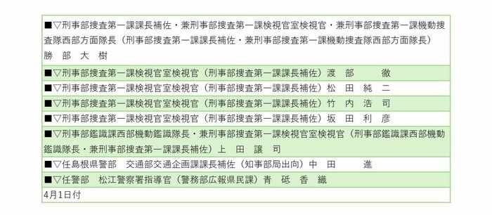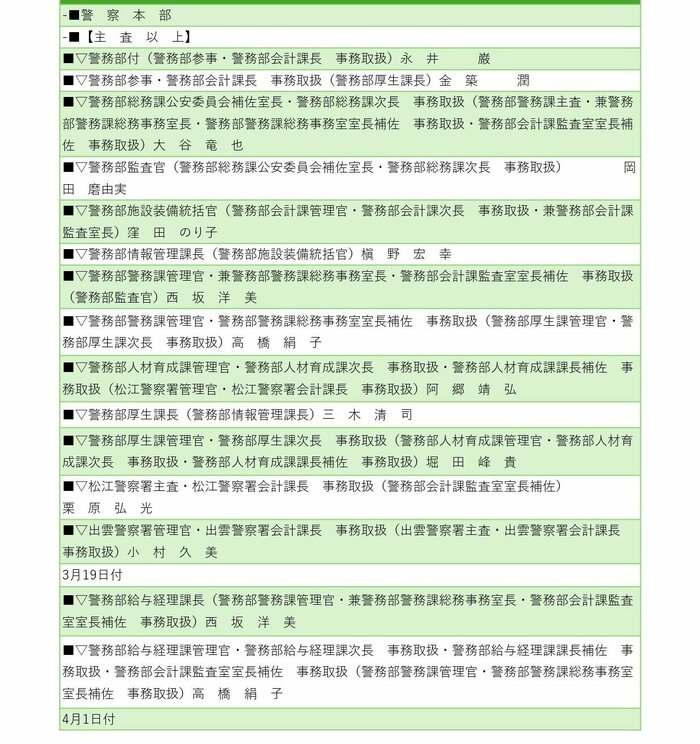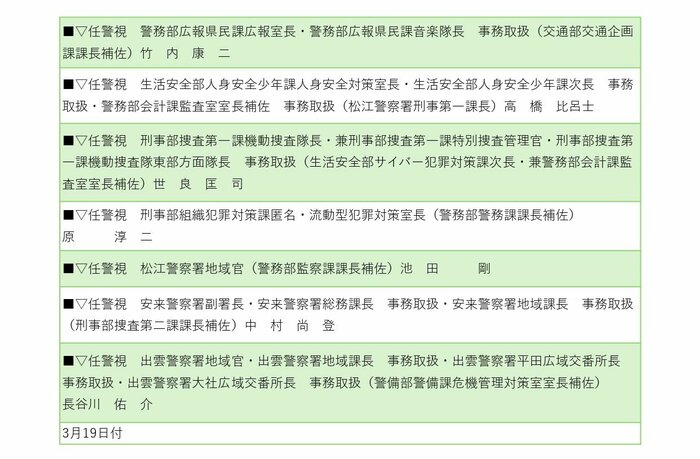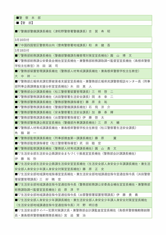 島根県警察本部は3月3日、2026年春の第1次人事異動を発表した。