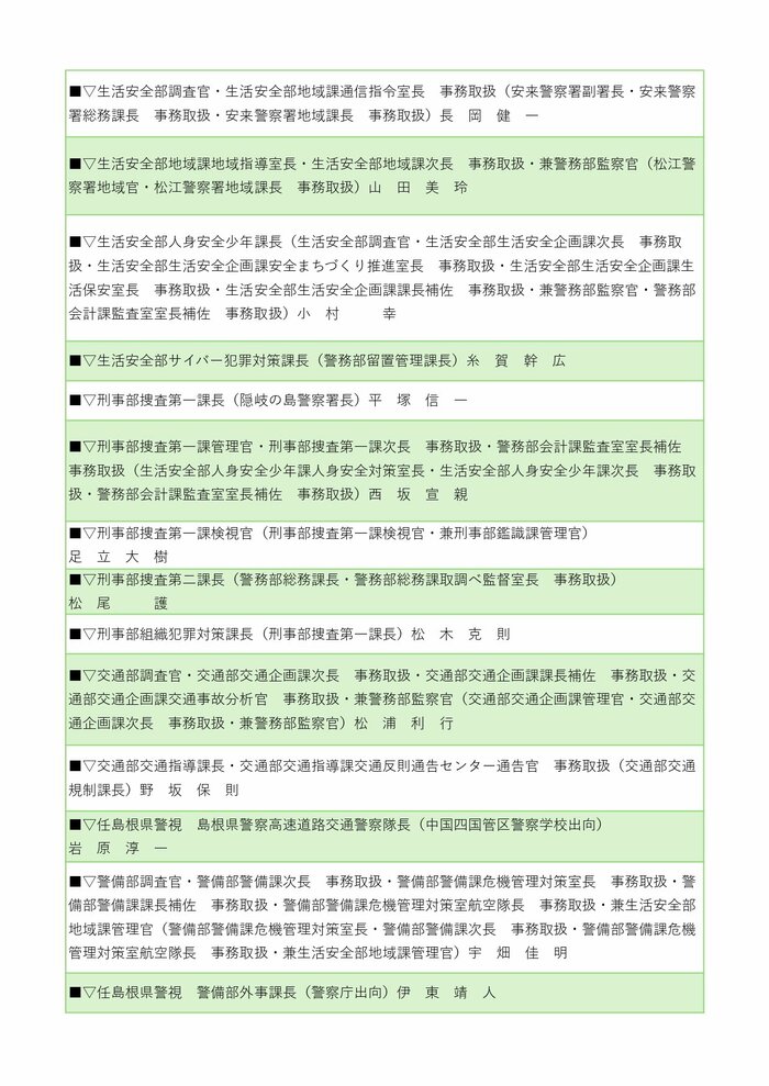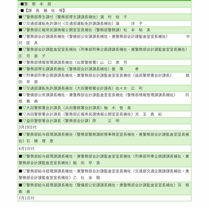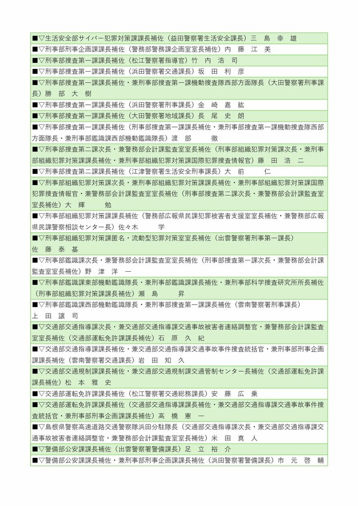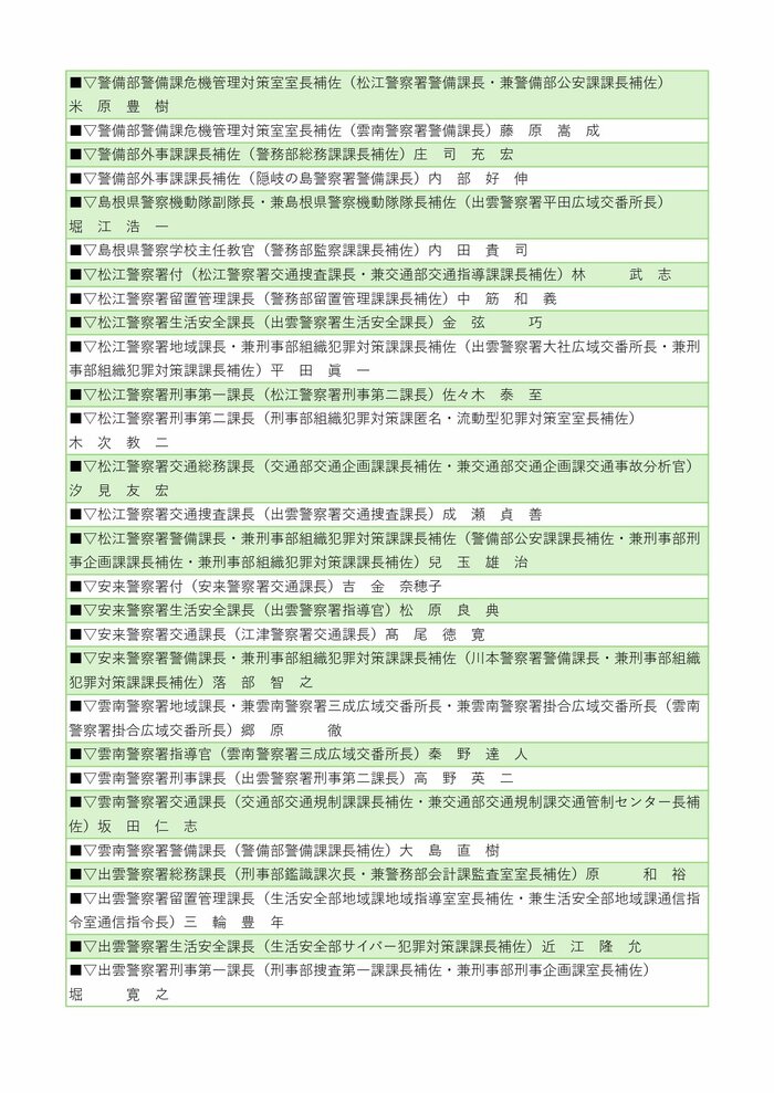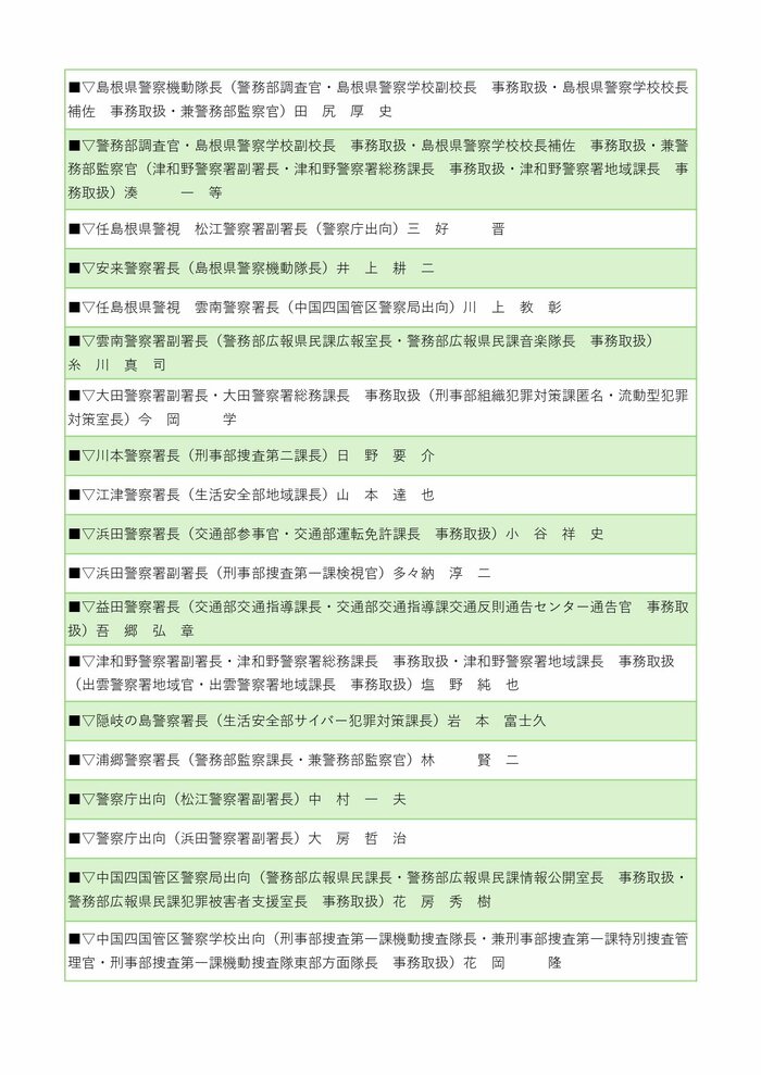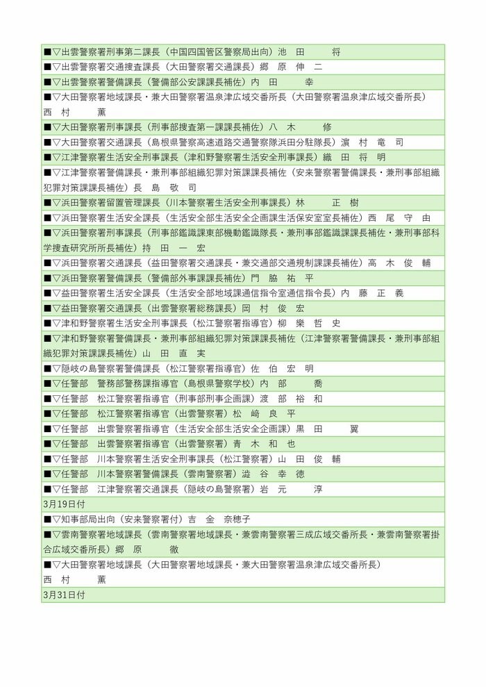 警察署長の人事では、井上耕二警備部機動隊長が安来警察署長に、川上教彰氏(中国四国管区警察局出向)が雲南警察署長に就任する。その他、川本、江津、浜田、益田、隠岐の島、浦郷の各警察署長も交代する。