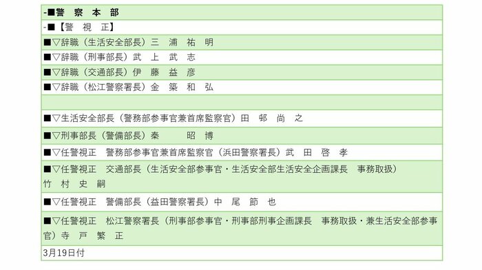 金築和弘松江警察署長も退職予定で、後任には寺戸繁正刑事部参事官が警視正に昇任して就任する。