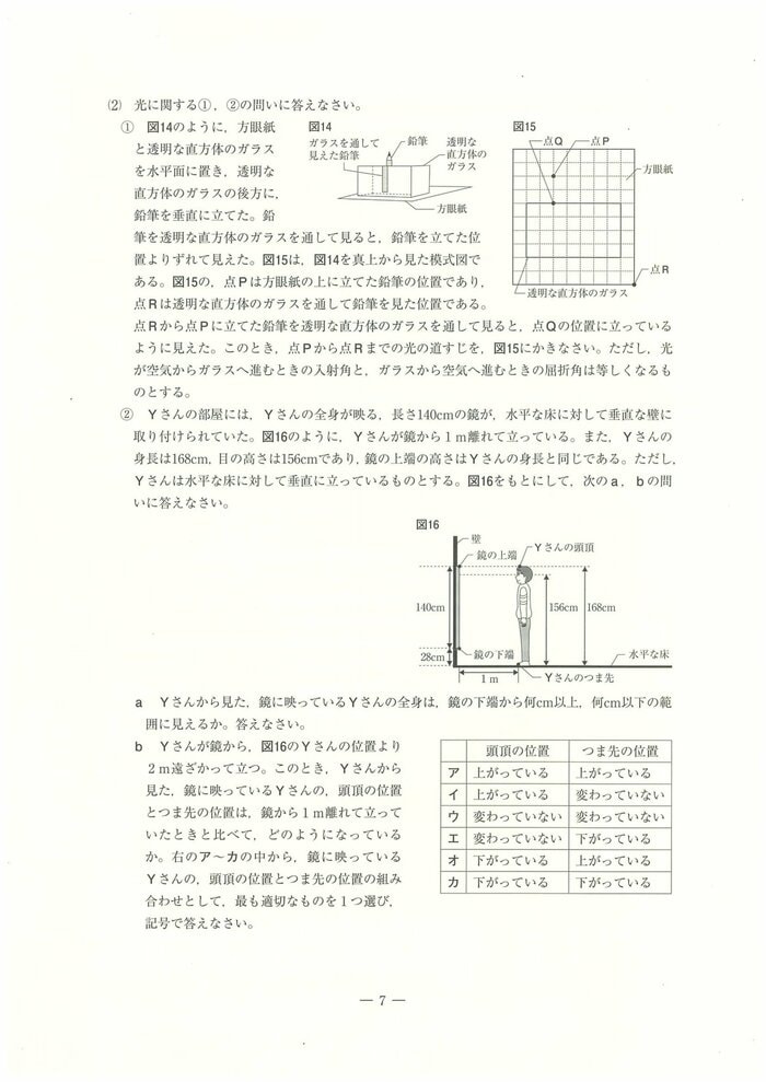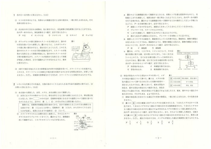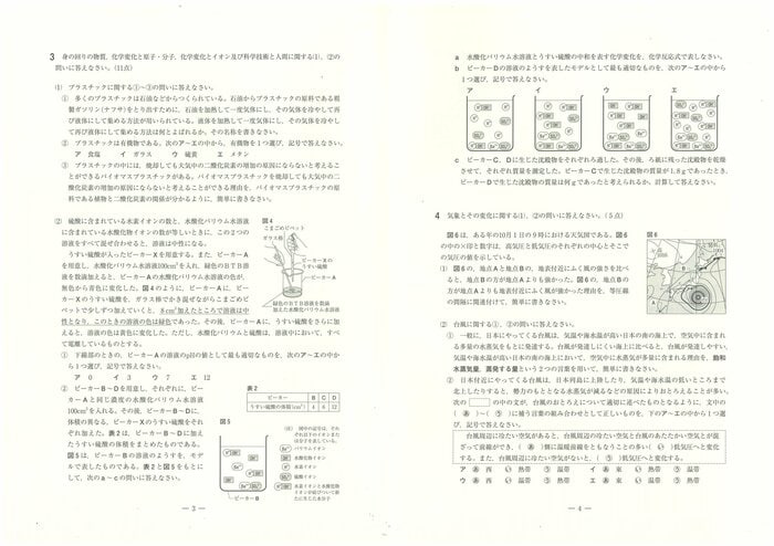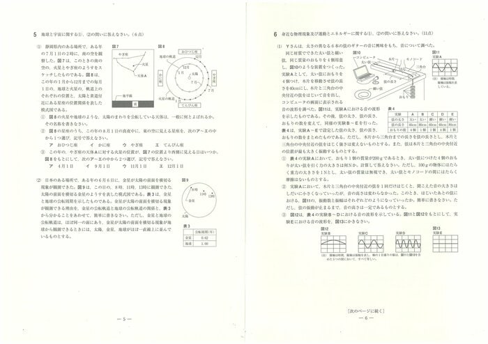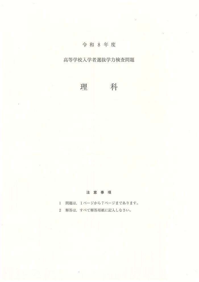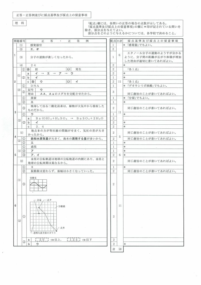 県教育委員会は社会に関する出題のねらいについて「1は基礎的・基本的な事項、2はいろいろな生物とその共通点、生物の体のつくりとはたらき及び生命の連続性、3は身の回りの物質、化学変化と原子・分子、化学変化とイオン及び科学技術と人間、4は気象とその変化、5は地球と宇宙、6は身近な物理現象及び運動とエネルギーに関する問題である。出題に当たっては、観察や実験に重点を置き、自然の事象について、知識や理解の程度及び科学的に考察する力を見るようにした」としている。